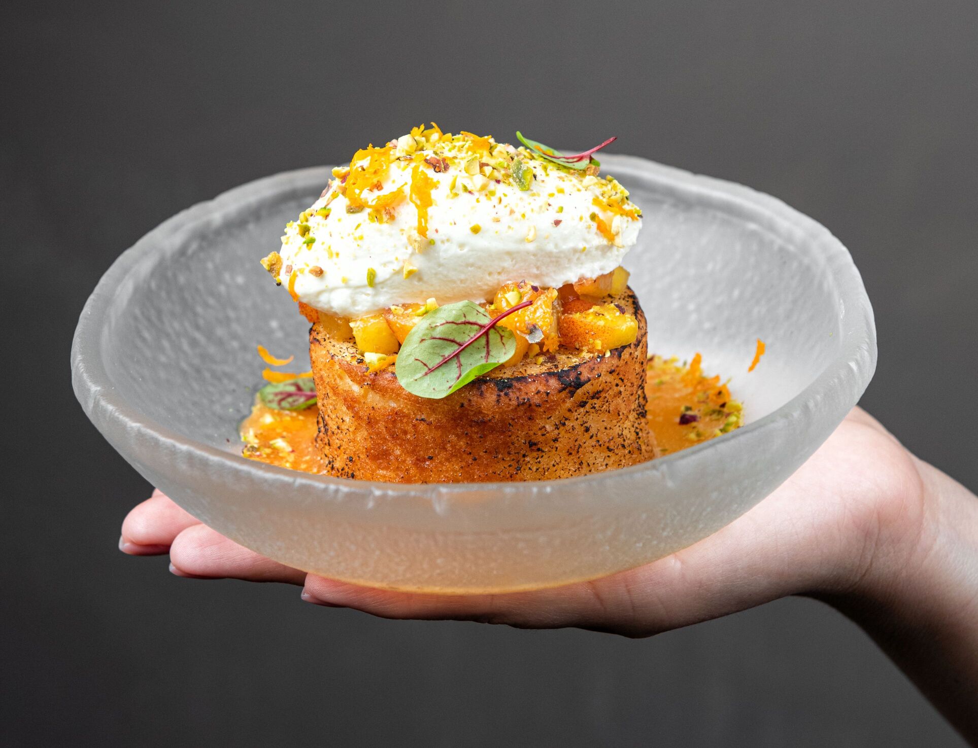 Если перед вами стоит задача сделать впечатляющий контент для соцсетей, обязательно обратите внимание на ромовую бабу в новом ресторане Генриха Карпина. Эффектная подача прямо у стола — сначала бриошь «воспламеняют» смесью из рома, специй и сиропа, а после «успокаивают» невесомым кремом из маскарпоне. Щедрая горсть свежей малины завершает представление.
