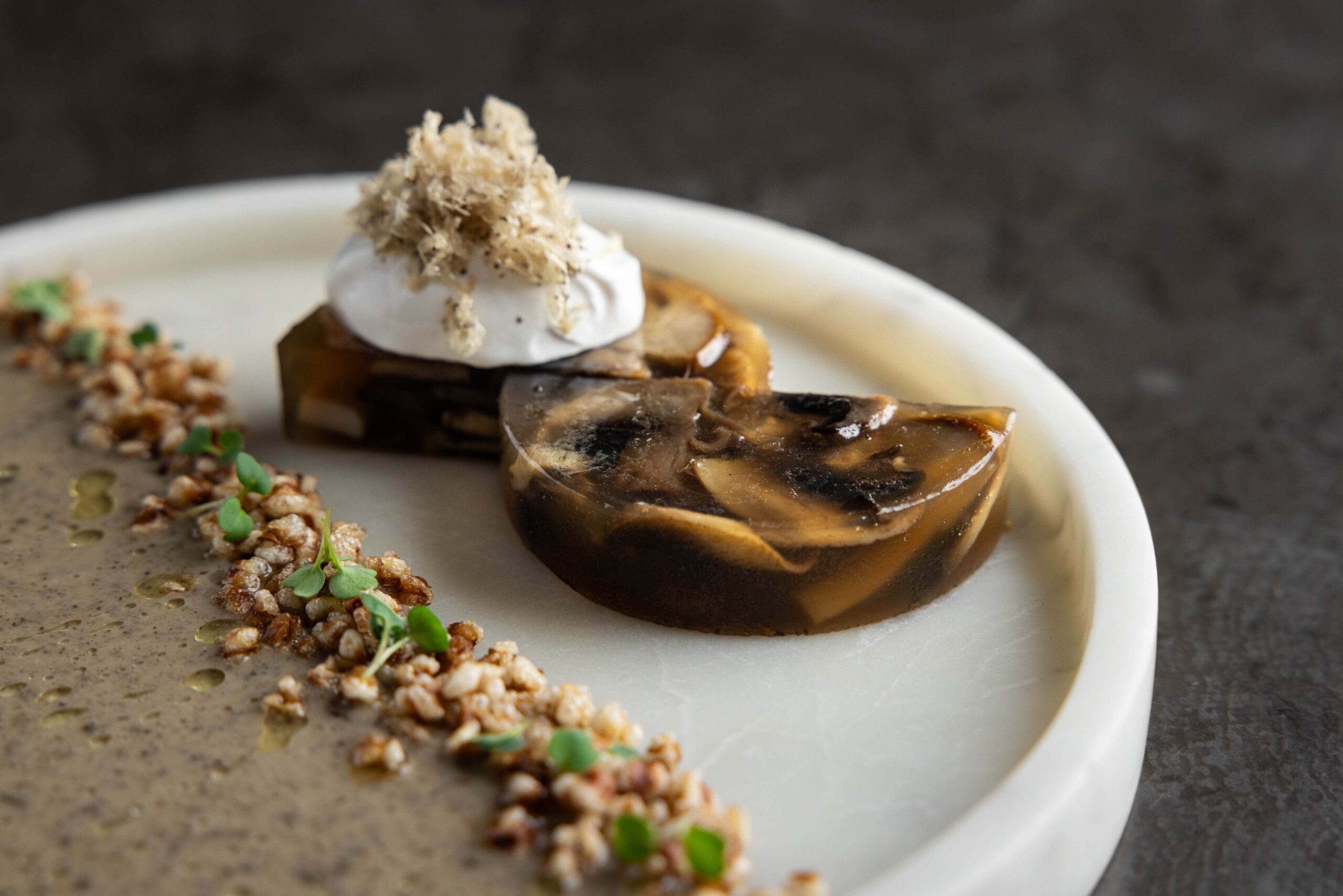 Меню Сергея Балашова удивляет с первых строчек. Например, заливным из грибов. Его подают с попкорном из гречки, черным трюфелем и соевой сметаной.