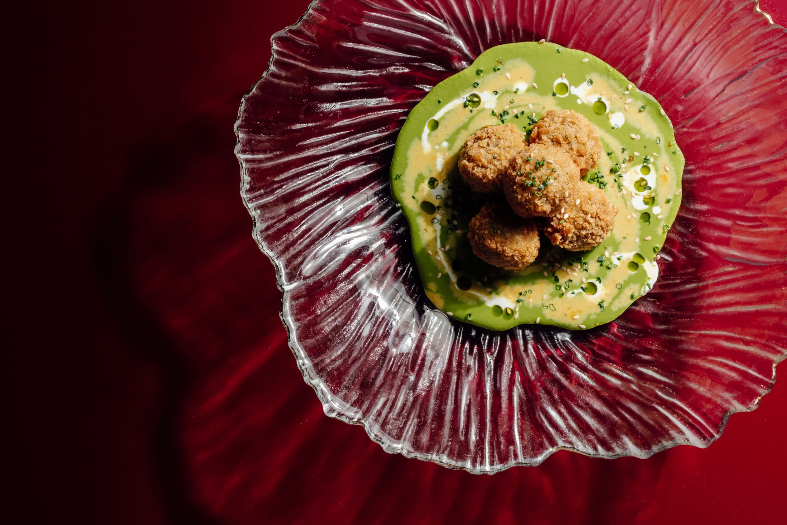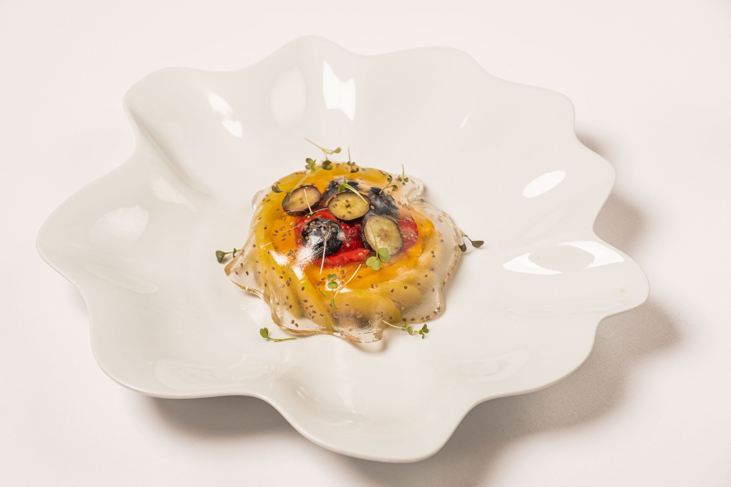 Шеф-кондитер Бек Караев придумал необыкновенный десерт, который выглядит как иллюзия. В равиоли из фруктов подчеркнута их естественная сладость, свежесть и чистый вкус. На вид — это точно один из самых изящных постных десертов в городе.