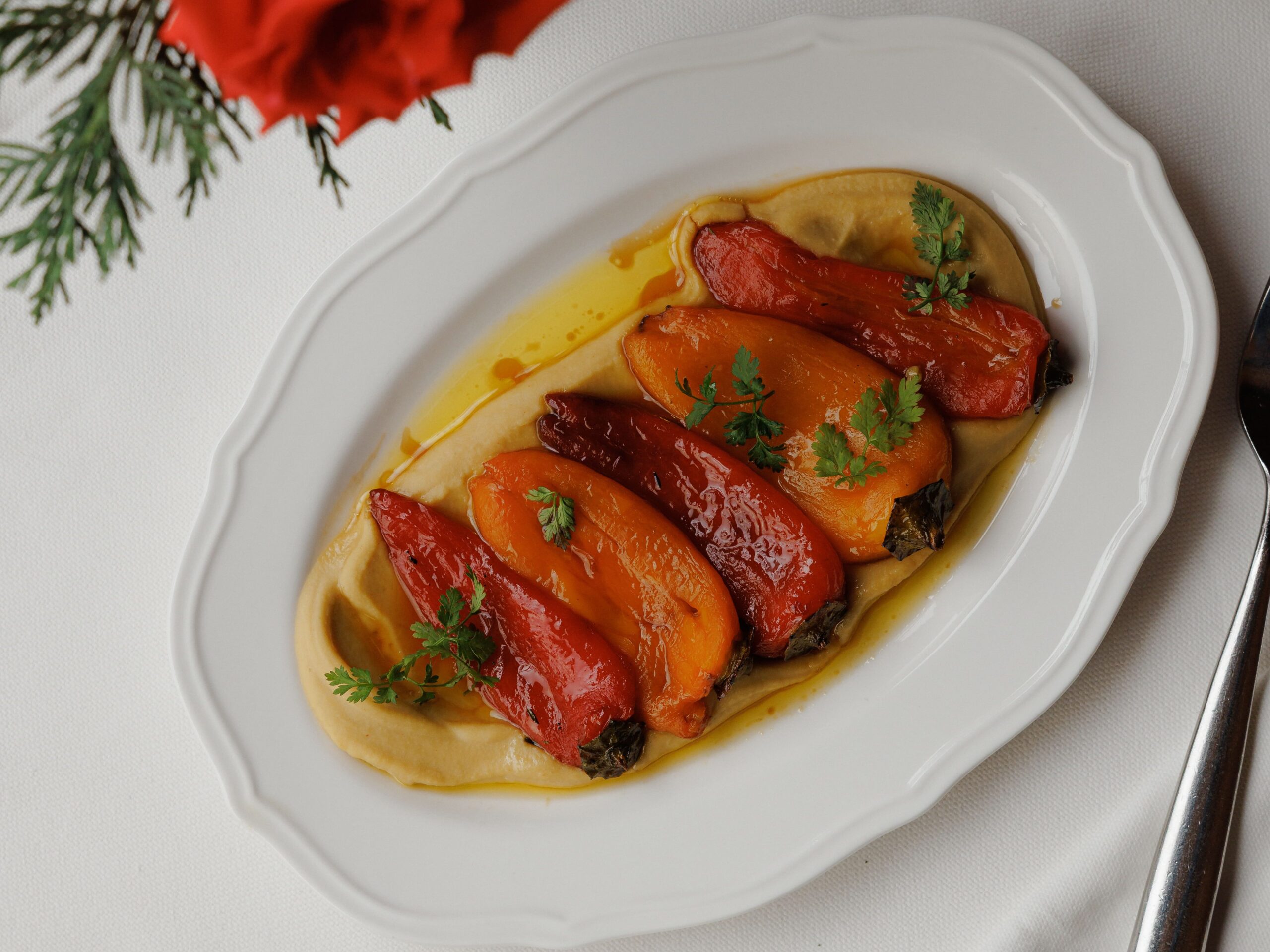 Запеченные мини-перцы подают с нежным хумусом, который подчеркивает их природную сладость. Получается лаконично, но очень гастрономично.
