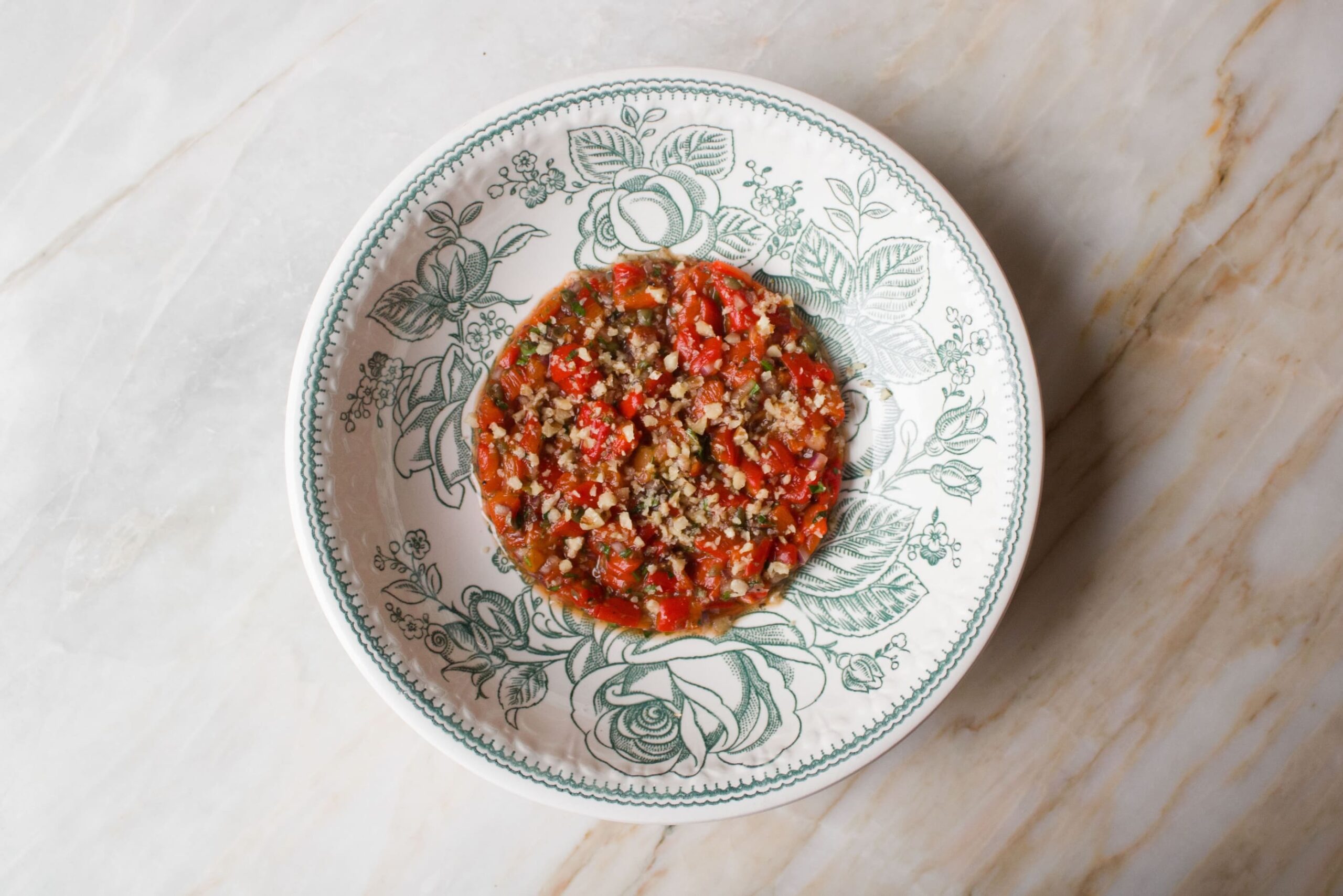 В Kalabasa решили обыграть тартар — блюдо, которое обычно ассоциируется совсем не с овощами. Здесь его готовят из запеченного перца, добавляя грецкий орех для текстуры и пикантности. Получается простое по составу, но яркое по вкусу блюдо: сладость перца, ореховая глубина и легкая пряность делают его насыщенным.