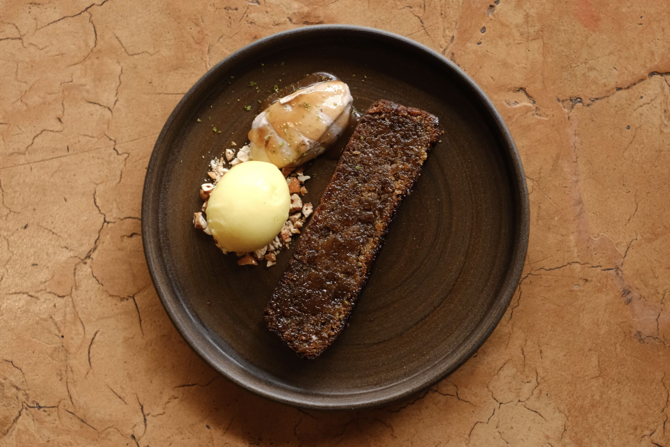 В постном меню Maya появился классный десерт. Банановый хлеб подают с ананасовым сорбетом, карамелизированным кешью и соусом из кокосовой сметаны с шоколадом. Получается сложный и многослойный вкус. Здесь и тропическая свежесть, и карамельная сладость орехов, и мягкие шоколадные оттенки.