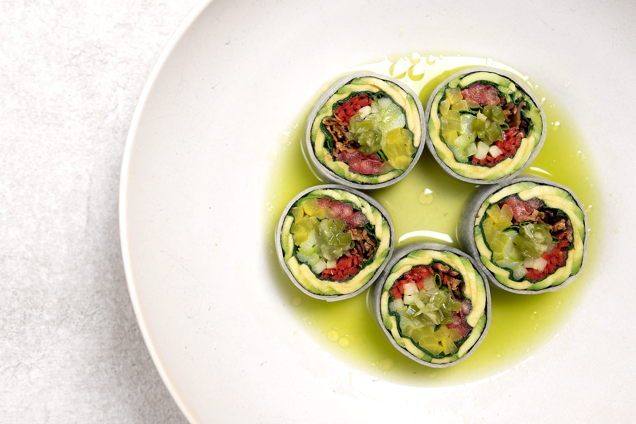 Овощные роллы в Sapiens выглядят как классические, но если попробовать или хотя бы присмотреться, заметите, что вместо риса — тонко нарезанный дайкон, внутри — авокадо, шиитаке и васаби Кизами — это не паста, а мелко нарезанный подмаринованный настоящий корень васаби.