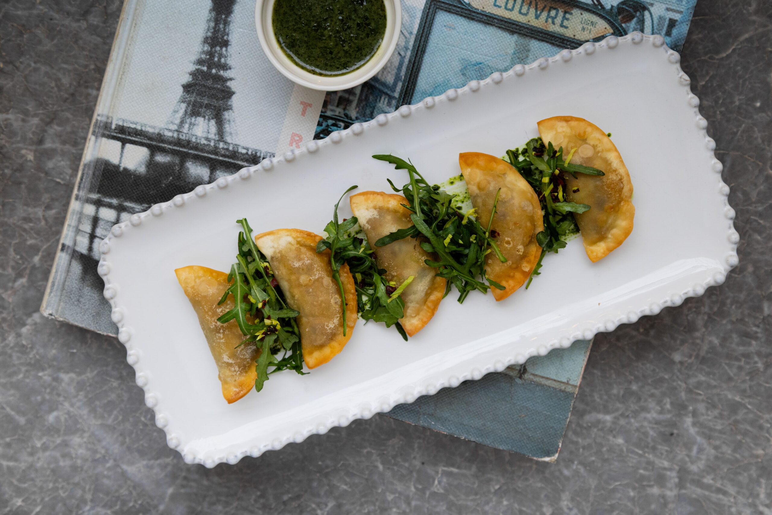 В постном меню ресторана появились мини-чебуреки «Барбажуан» — изящная версия средиземноморской классики. Привычная форма, но совсем неожиданное содержание: их начиняют рататуем и подают с луковым соусом.