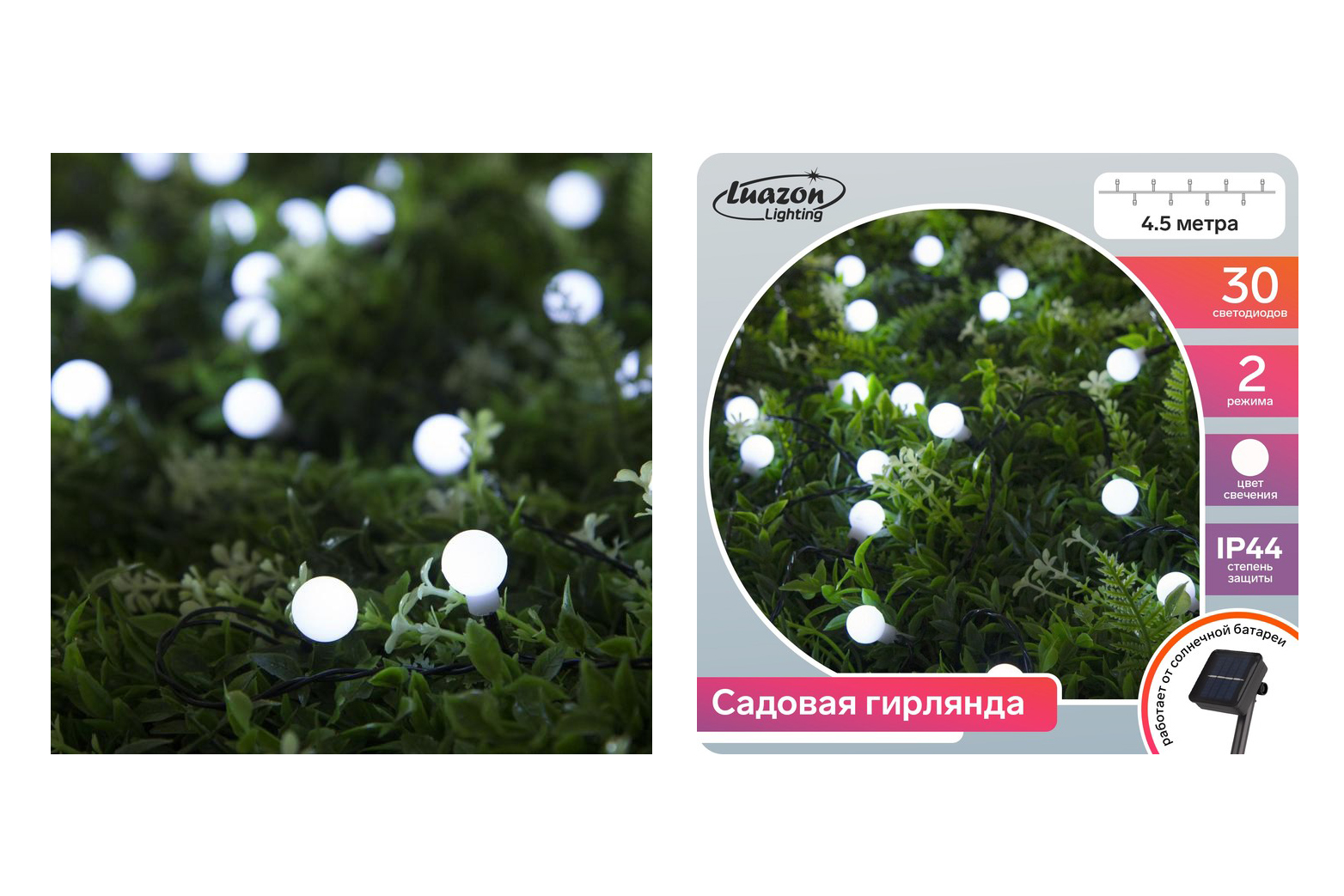 IP44, 30 LED, длина – 4,5 м, свечение белое, 2 режима работы