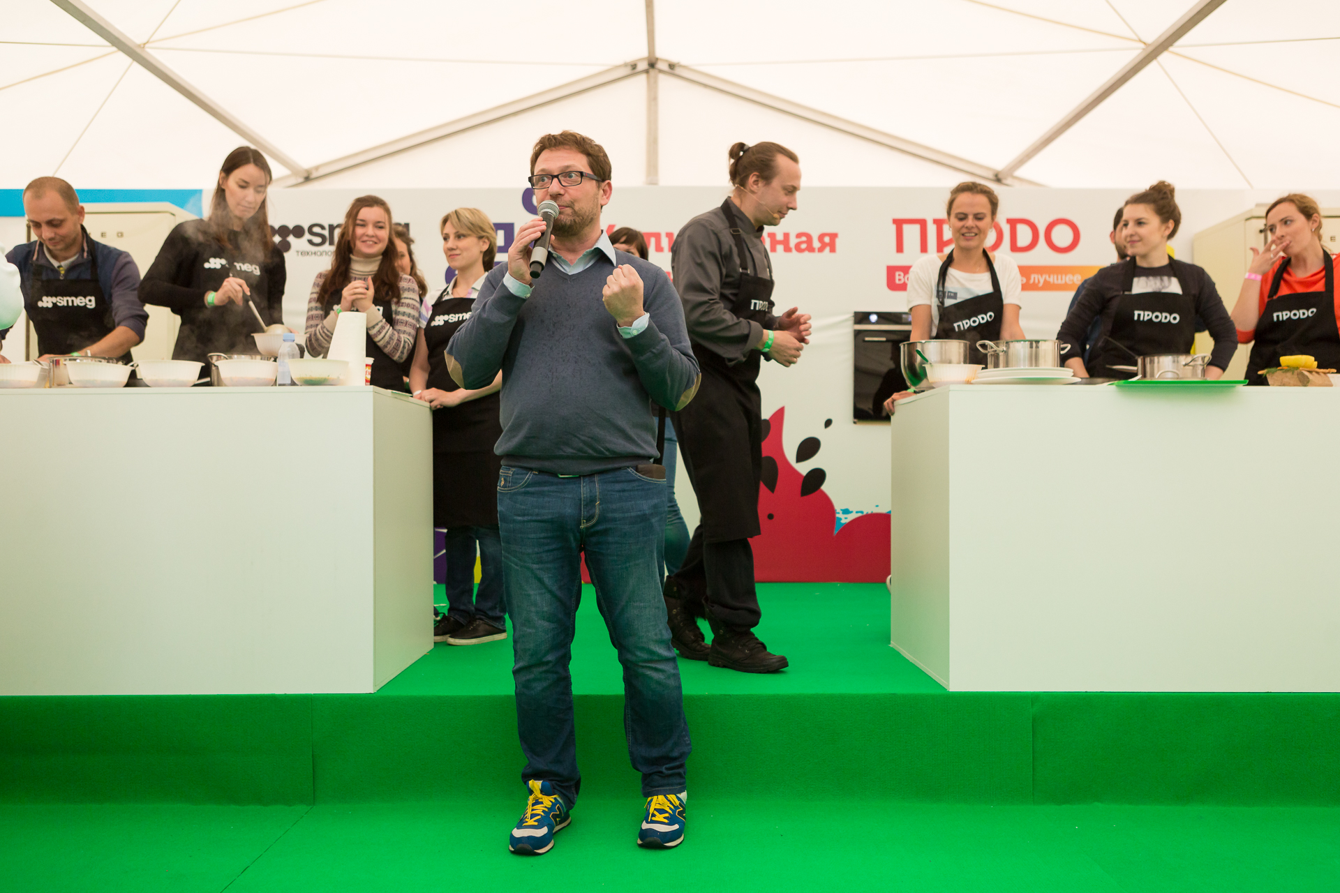 В этом году при поддержке гастрономических партнеров фестиваля – группы «ПРОДО» – на Большом летнем фестивале состоялись также настоящие кулинарные поединки! Соперники готовили завтраки и обеды, соревновались в приготовлении лучшего бургера и просто показывали своё мастерство. Одной из приглашенных команд стали сотрудники московского офиса SMEG – они выступили в кулинарном баттле против итальянского повара Умберто Джираудо и его группы фуд-стилистов. Вел поединок Василий Емельянено – ведущий «Кулинарного поединка» на НТВ. Блюдо, которое необходимо было приготовить соперникам всего за один час, стал русский суп – солянка. Команда итальянского повара справилась с заданием отлично, но команда SMEG успела привнести еще и итальянский колорит блюду, приготовив традиционную итальянскую лепешку – фокаччу. На специальном аксессуаре – камне для пиццы – сделать это было совсем нетрудно! Итог поединка: дружественная ничья!
