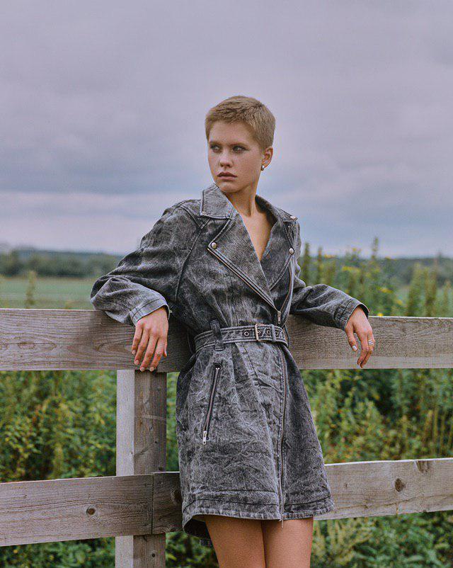 Еще один мутант — помесь джинсовой куртки, косухи и платья. Модель достаточно агрессивна, чтобы держать на расстоянии всех тех, с кем не хочется лишних разговоров. Требовательна к характеру владельца. Идеальное сопровождение к этому платью — ботинки с высоким голенищем.