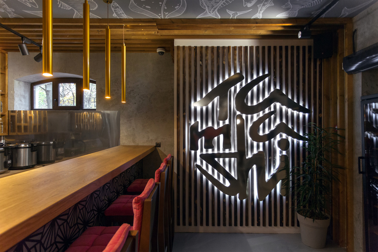 Дизайн ресторана выдержан в спокойных тонах: светлый бетон с легкой фактурой, черный металл, натуральные дуб и сосна. Стены расписаны изображениями гейш, цветущей сакуры и карпов кои. Пространство поделено таким образом, что в одном зале есть и уединенные места, и обеденные зоны для больших компаний.