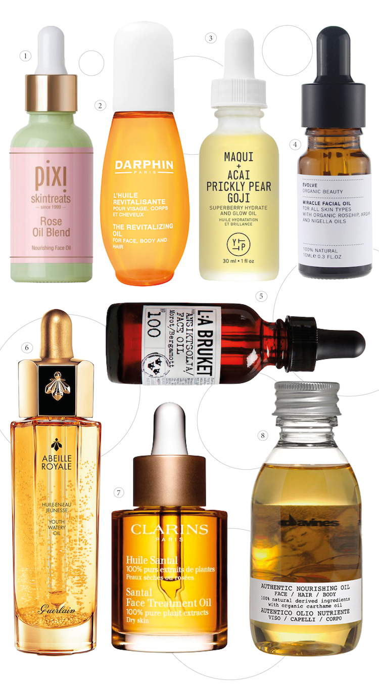 1. Питательное масло для лица с маслами розы, граната и розовой герани защищает, питает и укрепляет кожу Rose Oil Blend PIXI (купить за 1550 руб.) 2. Восстанавливающее масло для лица, тела и волос на 98% состоит из компонентов натурального происхождения The Revitalizing Oil Darphin (купить за 3230 руб.) 3. Масло для увлажнения и сияния кожи лица, мгновенно впитывается, содержит большое количество ценных веществ и редких ягод-суперфудов: асаи, макью, опунция, ягоды годжи, моринга, сквалан SUPERBERRY Youth to the people (купить за 3570 руб.) 4. Питательное масло с легкой текстурой для восстановления и ухода за зрелой кожей, борется с внешними повреждениями, устраняет раздражения, смягчает кожу, обладает легким розово-ванильным ароматом Miracle Facial Oil Evolve Organic Beauty (купить за 3100 руб.) 5. Масло для лица с экстрактом моркови, бергамота, маслом абрикосовых косточек и жожоба стимулирует производство коллагена и обогащает кожу витамином А, обладает заживляющим, антисептическим и успокаивающим действием 100 CARROT/BERGAMOT L:A BRUKET (купить за 4050 руб.) 6. Легкое масло для лица с эффектом лифтинга содержит редкий мед с острова Уэссан, масло мирры и особое маточное молочко Guerlain Abeille Royale Youth Watery Oil Guerlain (купить за 4799 руб.) 7. Масло для лица для сухой и чувствительной кожи с эфирныеми маслами сандала, кардамона и лаванды, которые тонизируют, снимают раздражение, успокаивают и восстанавливают баланс кожи Santal Face Treatment Oil Clarins (купить за 3370 руб.) 8. Питательное масло для лица, волос и тела содержит 100% ингредиентов органического происхождения, например, масло сафлора красильного (Carthamus tinctorius), являющегося мощным антиоксидантом и несущим защитную функцию Davines (купить за 3380 руб.)