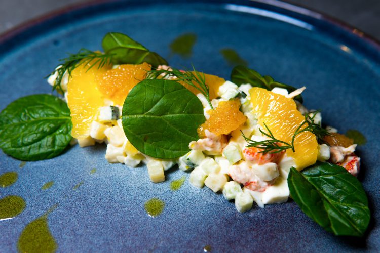 «Рибай» предлагает к заказу традиционные новогодние блюда (оливье, холодец, сельдь под шубой и т.п.), а также авторские блюда от бренд-шефа Романа Соловьёва – например, нежнейший салат с раковыми шейками (на фото).