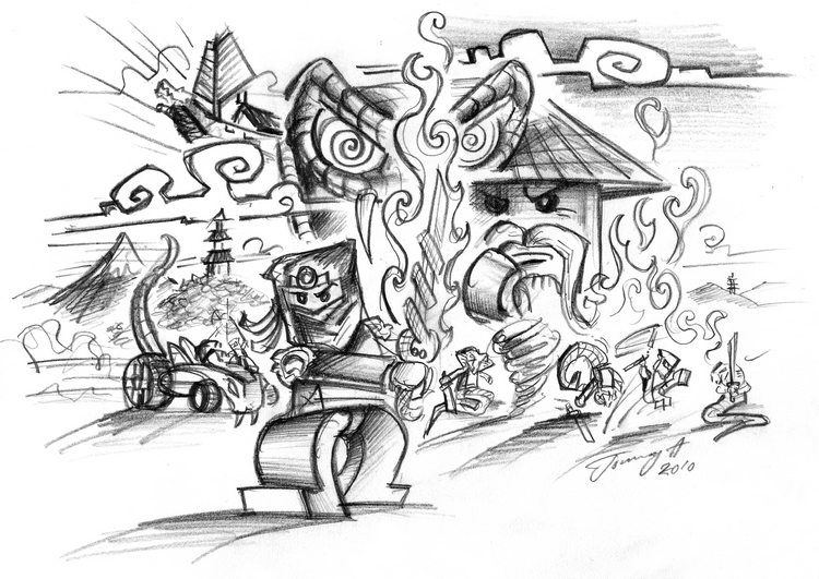 ‒ Осенью 2009 года Томми Андресен, один из создателей линейки LEGO NINJAGO, сделал эскиз с ниндзя, управляющими разными стихиями. После у команды возникла идея поместить персонажей на спиннеры, чтобы минифигурки героев могли активно вращаться, обеспечивая динамичную игру.