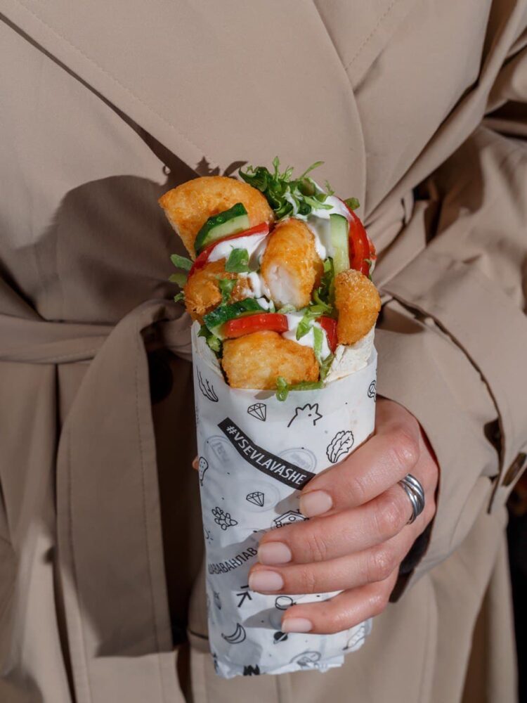 Из новинок хотелось бы упомянуть о шаверме с креветками, которую запустили на днях, ‒ это просто бомба! В стритфуд-заведениях вряд ли такое можно найти, разве что в ресторане… А у нас шаверму с креветками можно попробовать по вполне приемлемой цене и в удобном формате.